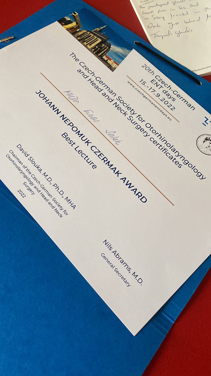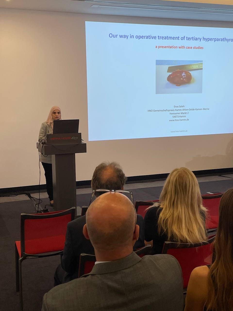 Dr. Enas Saleh participated in the 20th annual German-Czech Conference for Otorhinolaryngologie, Head and Neck surgery, where the fellow gave a valuable lecture on the methods of surgical treatment of hyperthyroidism, and reviewed the results of surgeries on patients who were operated on by the surgical team in which the colleague participated. Dr. Enas won the first prize for best presentation!