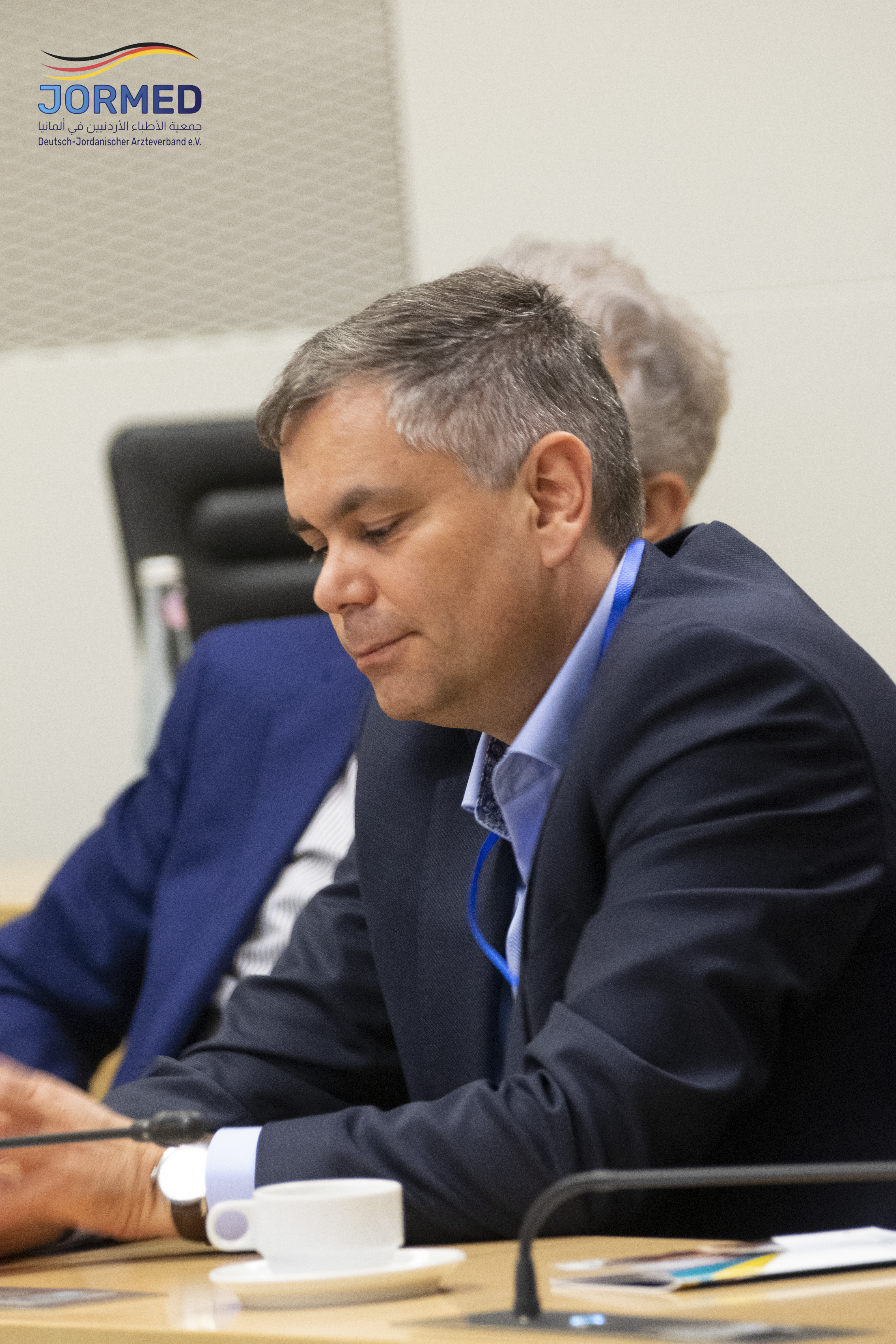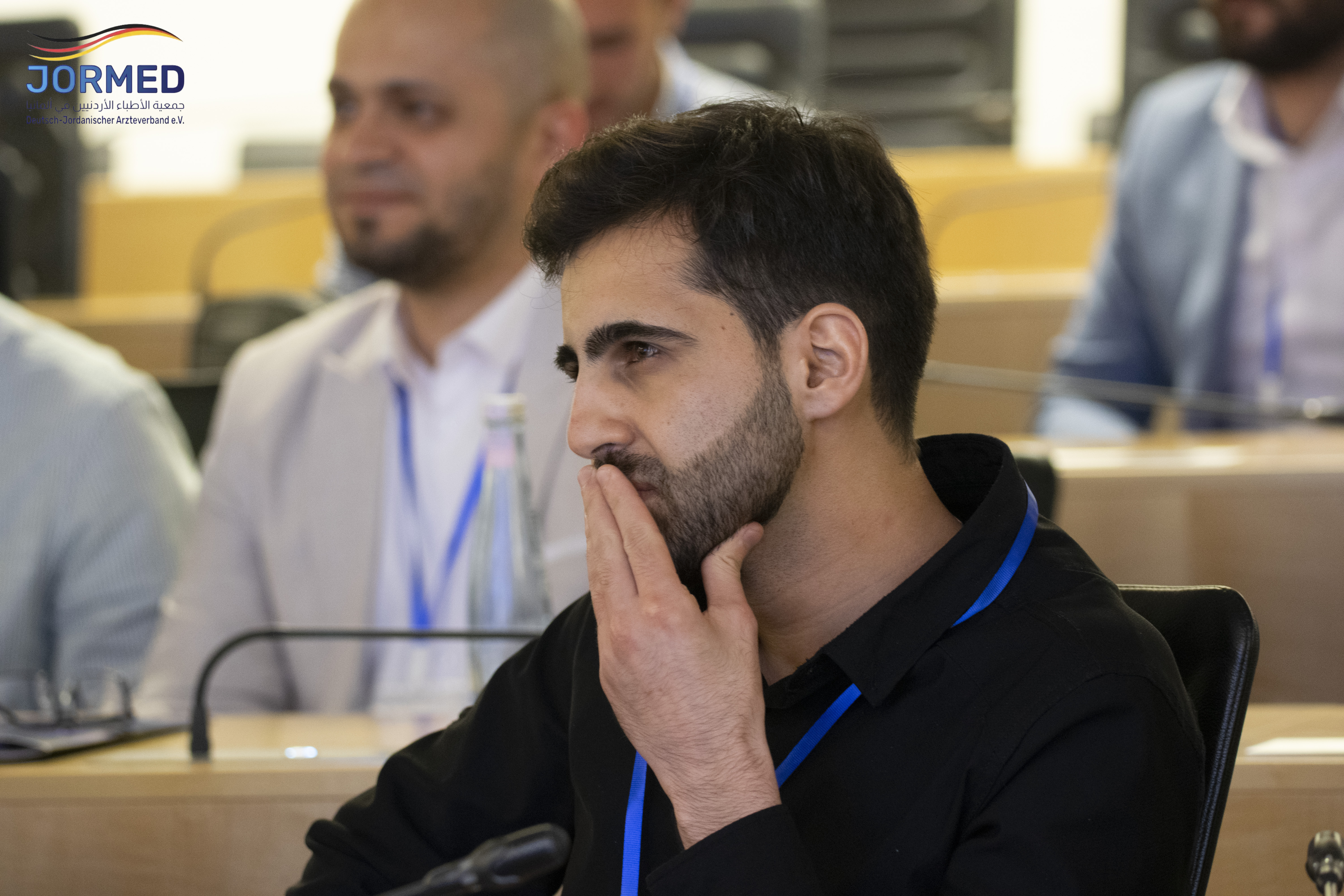 Dr. Moan Al-Sharman, the conference moderator, closed the event by thanking all speakers and participants for their valuable contributions. He emphasized the human dimension of medicine, urging Jordanian doctors in Germany to remain effective channels of communication between their homeland and the German medical community. He reminded that medicine is a humanitarian mission before being a profession, calling upon doctors to continue working with responsibility and collaboration.